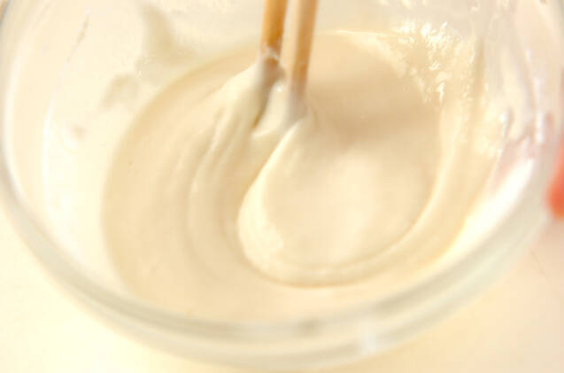 <衣>の材料はよく混ぜ合わせ、トロンとした状態に水加減を調整する。