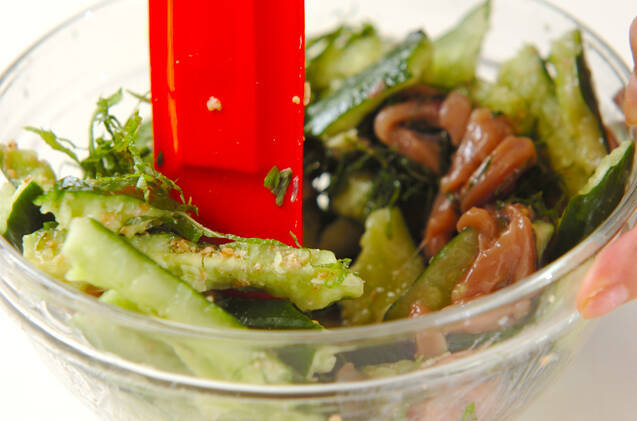 イカの塩辛、大葉、すり白ゴマを合わせ味をなじませる。5分くらいおいたらキュウリを加えてサッと和え、器に盛る。