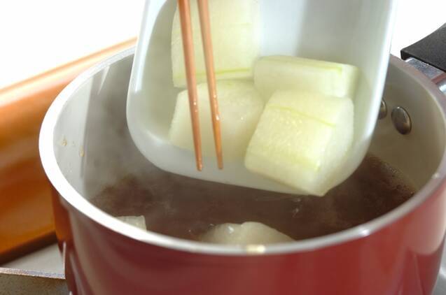 (2)の鍋に<煮汁>のその他の材料を加え、チキンスープの素が溶けたら冬瓜を加え、中火で5~6分煮る。火を止め、冷ましながら味を含ませる。
