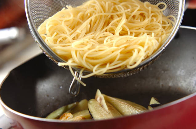 ゆで汁を大さじ6加え、ナスがしんなりするまで弱めの中火で炒めて、ニンニクを戻し入れる。さらにゆで上がったスパゲティー、ブラックオリーブを加え、塩コショウで味を調え、全体に混ざったらイタリアンパセリも合わせ、器に盛り分ける。
