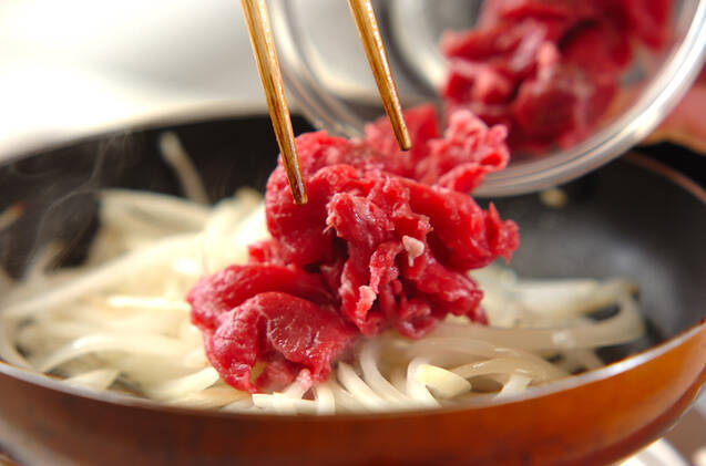 牛肉を入れてほぐし、<調味料>の材料を加えて汁気が少なくなるまで炒める。