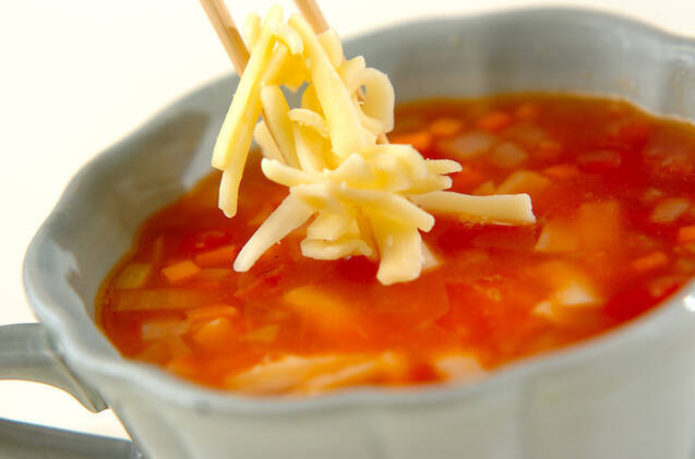 水煮コーンを加え、タバスコ、塩コショウで味を調える。器に注ぎ、ピザ用チーズを散らす。