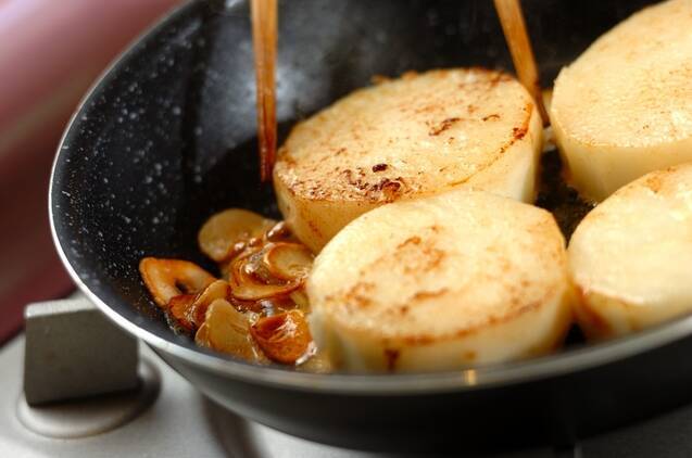 フライパンにニンニク、バターを入れて中火にかけ、香りがたったら長芋を入れて両面に焼き色がつくまで焼く。