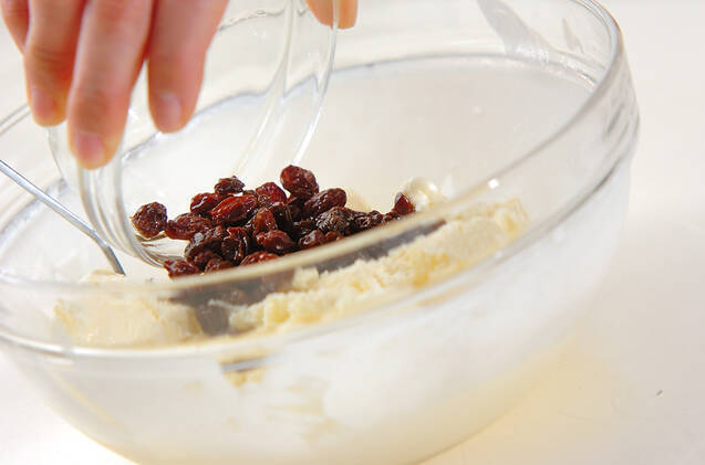 バニラアイスは室温に置き、スプーンで混ぜられる位の柔らかさになったらラム酒ごとレーズンを加えて混ぜ合わせる。