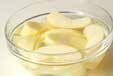 リンゴは8つに切り、芯を取って皮をむく。色が変わらないように塩水に放ち、水気をきる。