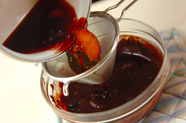 (1)を再び温め、半量を(2)の中に加えながら泡立て器で混ぜる。混ざったら残りの(1)も同様に混ぜる。