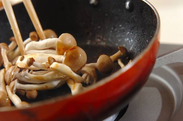 (1)のフライパンにシメジを入れ、煎るように炒めて<ドレッシング>と合わせる。