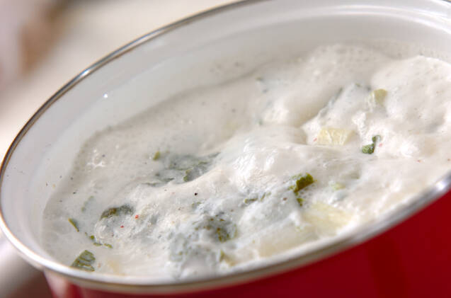 鍋にバターを入れ中火にかけ、バターが溶けたらセロリ、ジャガイモ、玉ネギ、白ネギを軽く炒め、水を加えて強火にする。煮立ったら火を少し弱めて10分煮、<スープ>を加えて3~4分煮る。