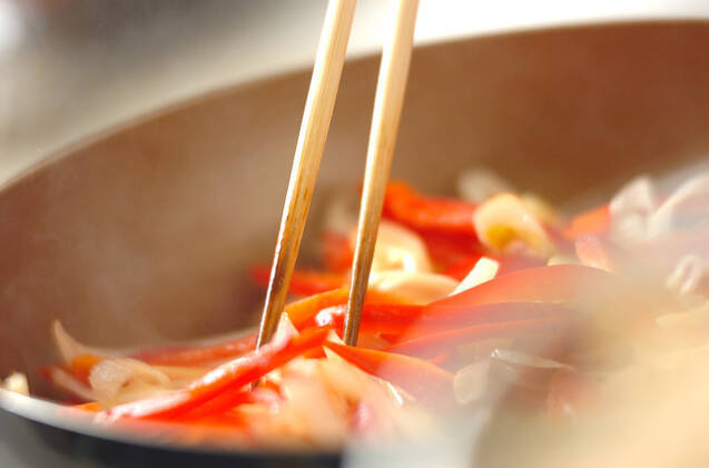 フライパンにサラダ油大さじ1を強火で熱し、野菜を手早く炒め合わせる。<調味料>の材料を加えてサッと炒め、器に盛り分ける。