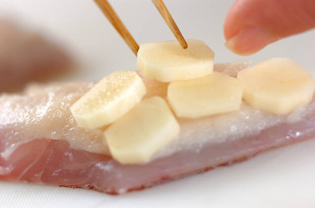 真鯛の切り身の皮と反対部分にホタテのすり身をぬり、ジャガイモの薄切りを魚のうろこのようにはりつける。フライパンにオリーブ油を熱し、うろこをつけた面から焼く。