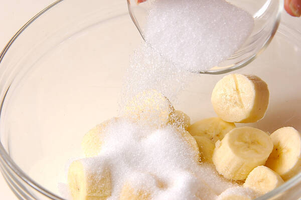 バナナは皮を剥き1cm幅の輪切りにして、グラニュー糖をからめる。