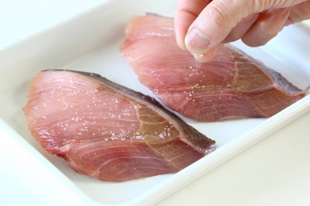 ぶりに塩を少々ふりかけ、10分くらい置き、水気が出てきたらキッチンペーパーで拭き取る。