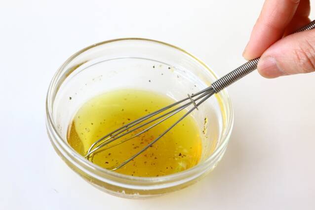 <ドレッシング>を混ぜ合わせておく。