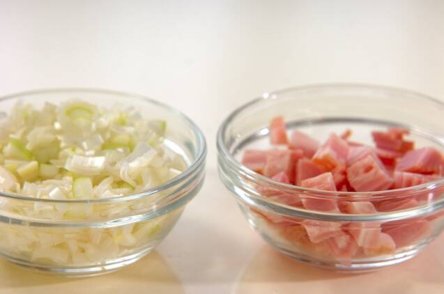 ベーコンは1cm角に切る。白ネギは粗みじん切りにする。