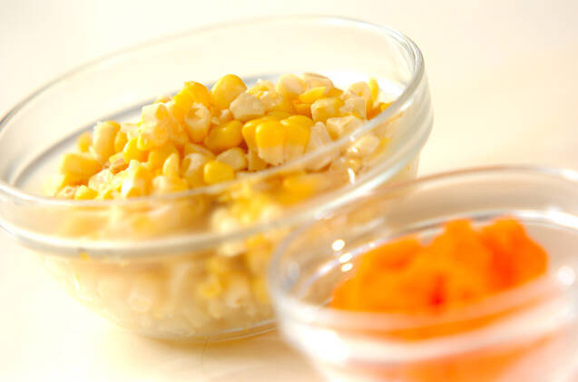 トウモロコシはたっぷりの熱湯でゆで、冷めたら包丁で粒を削ぎ落とす。<ちょっとヒント>生トウモロコシがない場合は、冷凍のものや水煮缶でも代用可能です。冷凍なら熱湯につけてもどし、水煮缶ならザルに上げて汁気をきって下さい。