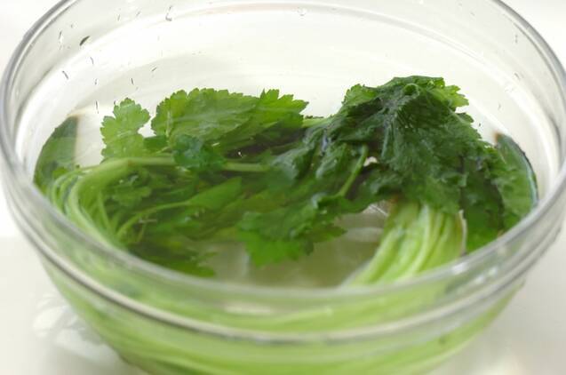 ミツバは熱湯でサッとゆで、冷水で冷やす。水気を絞り、根元を切り落とす。
