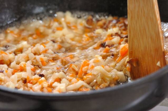 <ちらし寿司の素>を作る。フライパンにシイタケのもどし汁、酒、砂糖を入れ、強火にかける。沸騰したらシイタケ、水煮タケノコ、ニンジン、レンコンを入れ、混ぜながら煮る。