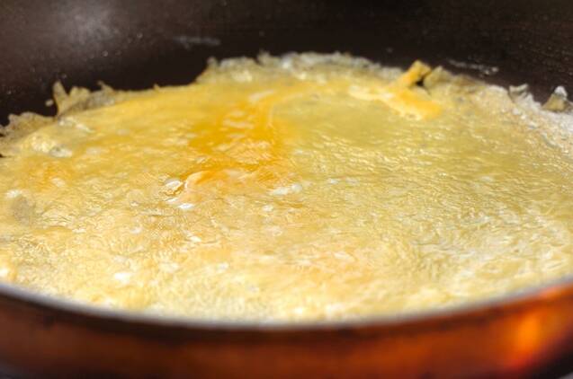 フライパンにサラダ油を薄くひき、<薄焼き卵>を6枚作る。