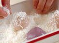 バット等にココナッツロング、アーモンドダイスをそれぞれしき、水気をきった3を転がしまぶしつける。ジャムを混ぜた団子にはココナッツロングをまぶし、そのままの団子にはアーモンドダイスをまぶす。