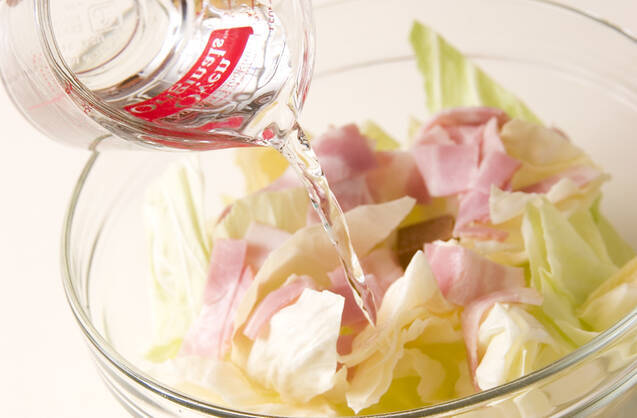 耐熱容器に固形ブイヨン、白ワイン、水、キャベツ、ベーコンを入れる。
