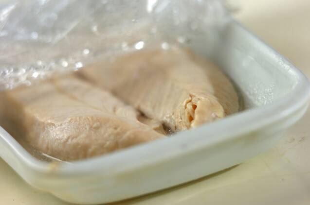鶏ささ身は筋を引き、酒をからめてラップをふんわりとかける。電子レンジで1分30秒~2分加熱して火を通し、そのまま粗熱を取る。
