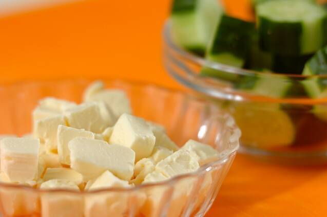 キュウリは両端を少し切り落とし、ピーラーなどで縦じまに皮を所々むき、小さめのひとくち大に切る。クリームチーズは1cm角に切る。