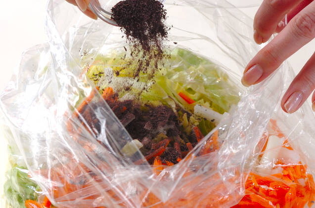 ビニール袋に野菜とゆかりを入れ、しんなりするまでもみ込み、水気を絞って、器に盛り分ける。