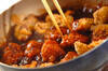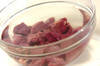 鶏レバーに塩コショウをし、<衣>の小麦粉、卵、パン粉を順につける。170℃の揚げ油で色よく揚げ、油をきる。
