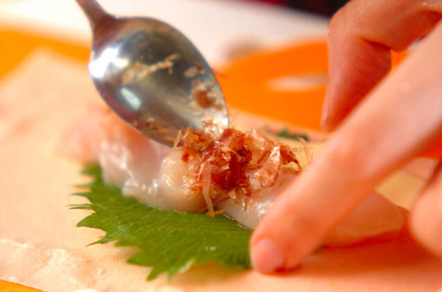 春巻きの皮に大葉をおき、スライスチーズ、鶏ささ身をのせ、<梅おかか>をのせる。