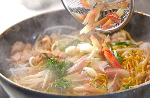 1の中華麺を加えほぐしながら炒めて大葉、ミョウガを加えて炒め合わせる。