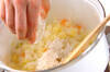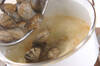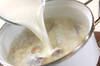 牛乳以外の<スープ>を加え、煮立ったら火を弱めて10分煮、殻付きアサリを加える。