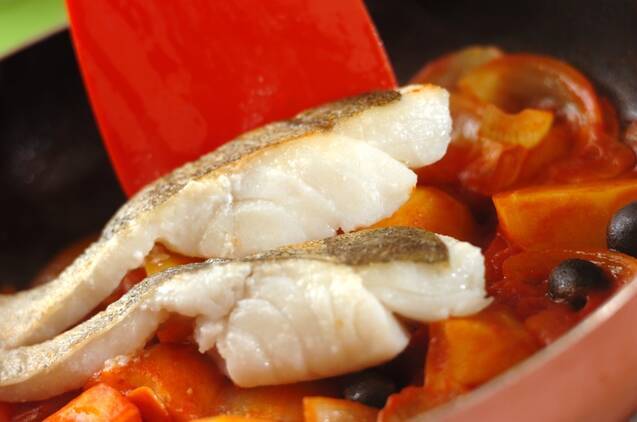 <スープ>の材料とブラックオリーブを加え、蓋をして10分程煮込む。タラを戻し入れてさらに2~3分煮る。分量外の塩、粗びき黒コショウで味を調え、器に盛り、パセリを散らす。