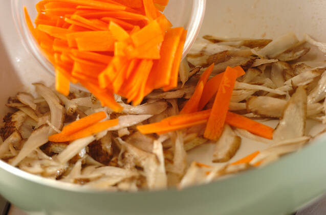 フライパンにゴマ油を強火で熱し、水きりしたゴボウを加え、ゴボウがしんなりしたらニンジンを加えて炒め合わせる。