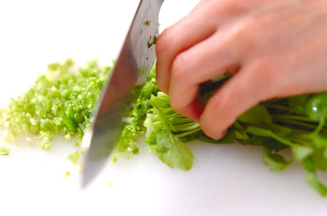 セリは根元を切り落として水洗いし、細かく刻んで水に放ってザルに上げる。熱湯に入れ、色が鮮やかになったらザルに上げ、流水で洗って水気を絞る。