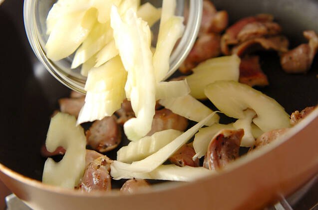 フライパンにサラダ油を入れ、砂肝を炒める。赤味がほぼなくなってきたらセロリを加え、炒め合わせる。