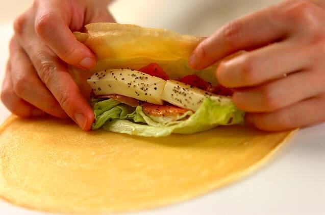 レタス、サーモンのマリネ、クリームチーズの順にクレープにのせ、粗びき黒コショウを振る。手前から巻き、皿に盛る。