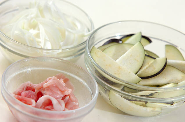 豚肉はひとくち大に切り、酒と塩をもみ込む。ナスはヘタを落として縦半分に切り、斜め薄切りにする。玉ネギは縦薄切りにする。