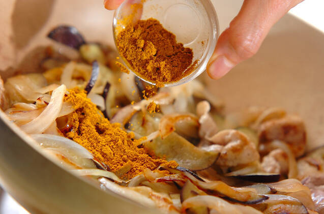 フライパンにサラダ油をひいてナスと玉ネギを炒め、火が通ったら豚肉を加える。豚肉が炒められたら、カレー粉を加えて混ぜ合わせる。塩コショウで味を調え、耐熱容器に1人分ずつ入れる。