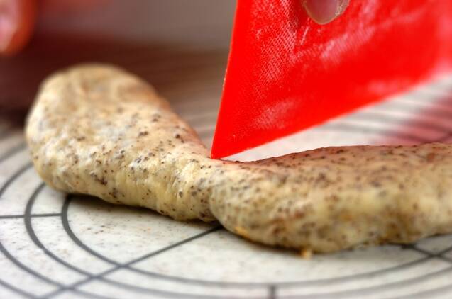 【成形】まんべんなくガスを抜き、8cmくらいの円形にする。奥側5mm残して真ん中を切り、左右へ開く。