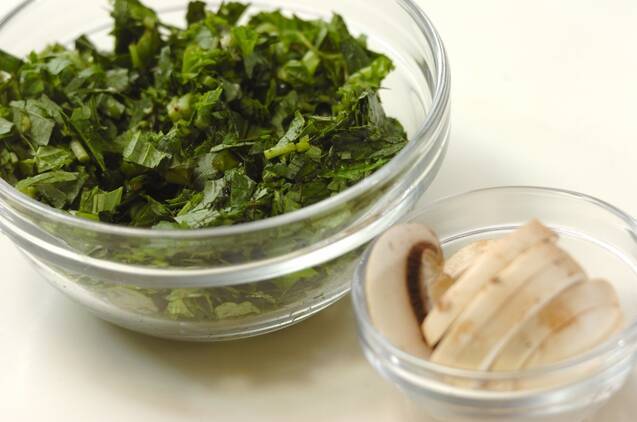 モロヘイヤはみじん切りにする。マッシュルームは石づきを切り落とし、キッチンペーパーで汚れを拭いて、幅5mmの薄切りにする。