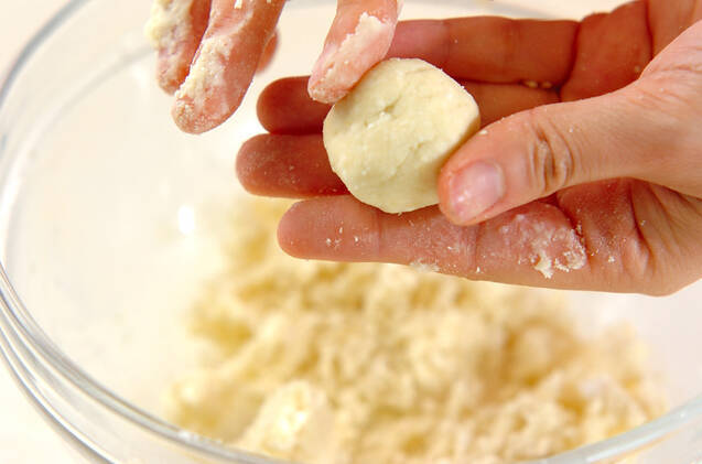 ボウルに白玉粉、水を練り合わせ、(1)のサツマイモを加えてさらに練る。しっとりまとまる位になったら、ひとくち大に丸めて湯を沸かした鍋に入れ、浮いたら1~2分ゆでて水に放ち、粗熱を取る。