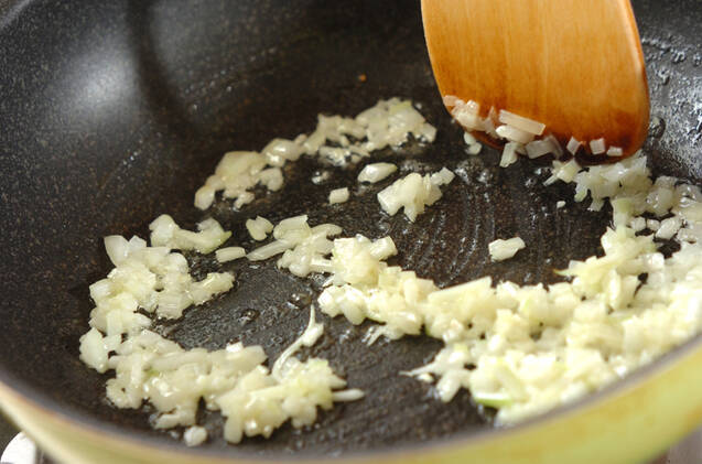 フライパンにバター10g、サラダ油を中火で熱し、バターが溶けたら玉ネギを加え、透き通るまで炒める。