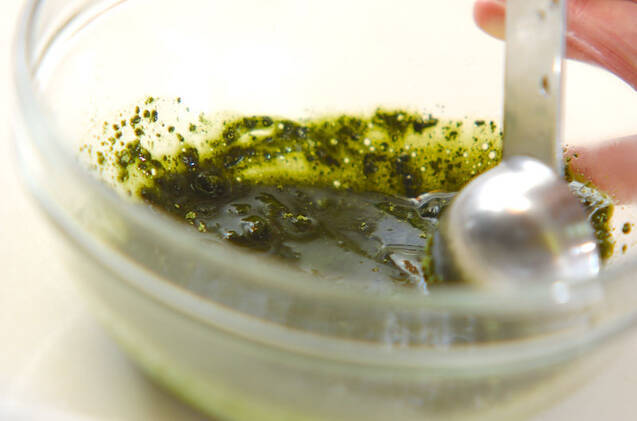 <抹茶シロップ>を作る。耐熱容器に抹茶、砂糖を合わせ、熱湯を加えてよく混ぜ合わせる。容器の底を冷水に当て、シロップを冷やす。