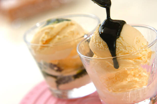 器にアイスクリームを盛って<抹茶シロップ>をかける。ゆで小豆、バナナを盛り合わせてウエハースを添える。