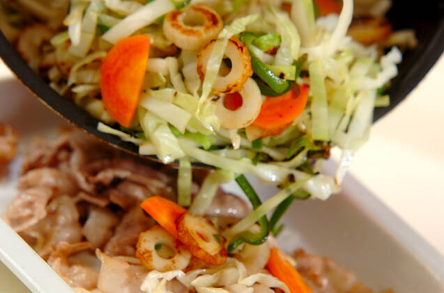 (1)のフライパンに野菜、ちくわを加えて炒め合わせ、しんなりしたらいったん取り出し、豚バラ肉と合わせる。(ヒント)具はお好みで冷蔵庫の残り物を加えてもいいですね。