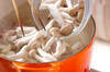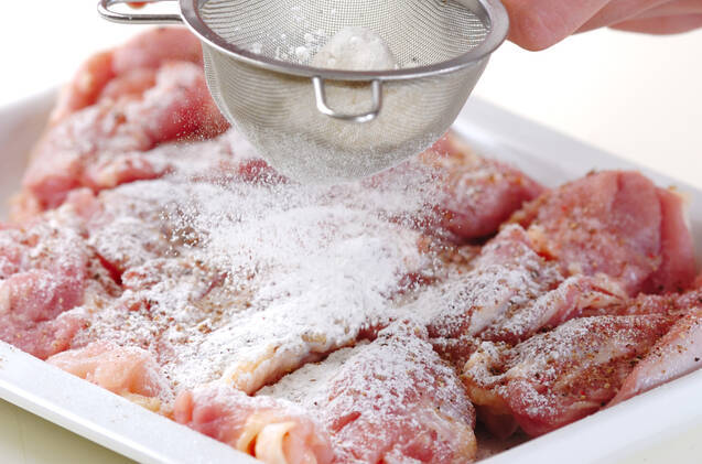 鶏もも肉は1枚を4つに切り、塩コショウをして小麦粉を薄くからめる。