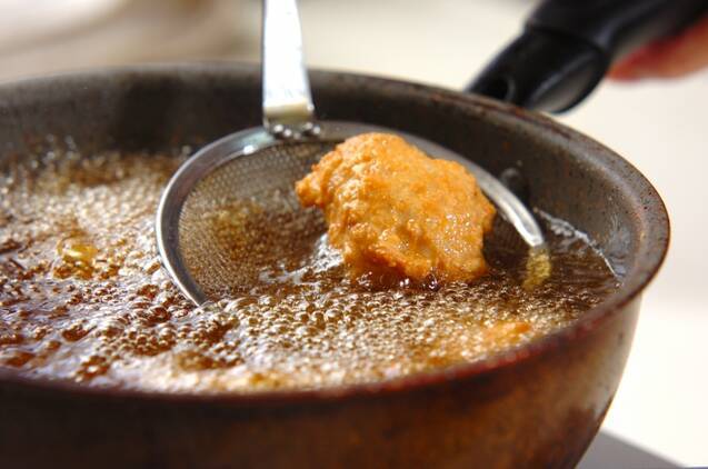 (1)をひとくち大にスプーン2本を使って形を整え、揚げ油で揚げ色がつくまで揚げる。