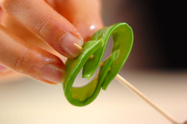 (2)の粗熱が取れたらラップを外し、キヌサヤを2枚葉っぱになるように刺し、ミートボールを3個ずつ串に刺す。