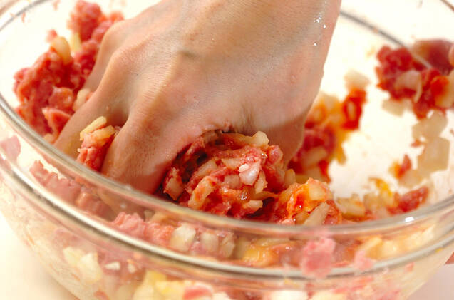 合いびき肉が白っぽくなってきたら、玉ネギ、溶き卵を入れて手で手早く混ぜる。※玉ネギから水分が出やすいため、手早く混ぜましょう。