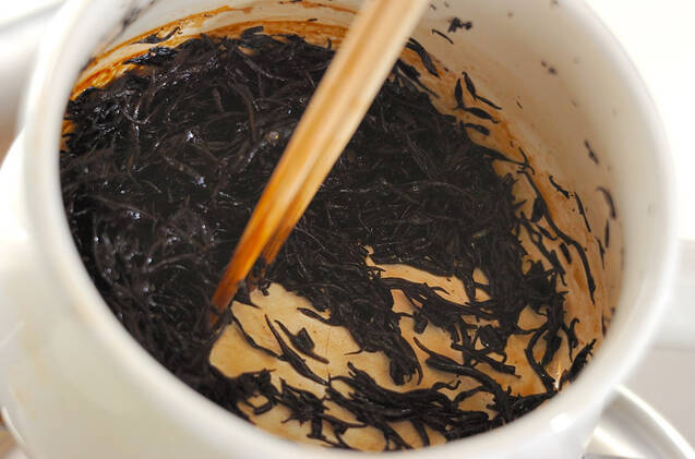 鍋に芽ヒジキ、<合わせだし>の材料を入れて強火にかける。煮汁がほとんどなくなるまで時々混ぜながら煮て、粗熱が取れるまで冷ましておく。